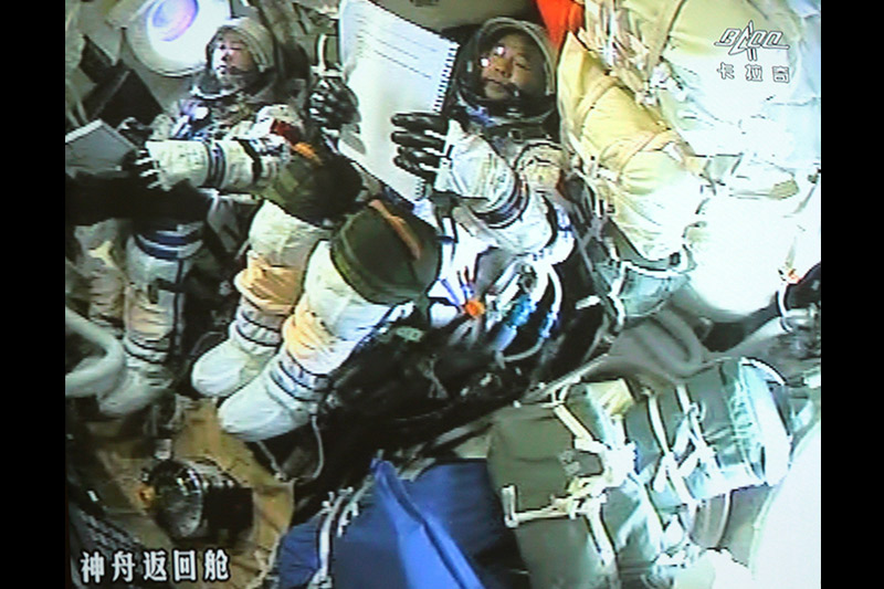 這是2016年11月18日在北京航天飛行控制中心大屏幕拍攝的神舟十一號飛船返回艙內(nèi)的畫面。2016年11月18日13時59分,神舟十一號飛船返回艙在內(nèi)蒙古中部預(yù)定區(qū)域成功著陸,執(zhí)行飛行任務(wù)的航天員景海鵬、陳冬身體狀態(tài)良好,天宮二號與神舟十一號載人飛行任務(wù)取得圓滿成功。