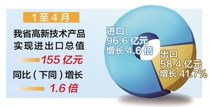 本報訊(記者邢杰冉通訊員楊寶麗)據(jù)石家莊海關統(tǒng)計,1至4月,我省高新技術產(chǎn)品實現(xiàn)進出口總值155億元,同比(下同)增長1.6倍。其中出口58.4億元,增長41.7%;進口96.6億元,增長4.6倍。