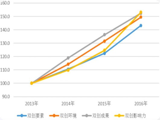 圖片說明:楊浦“雙創(chuàng)指數(shù)”4個一級指標的逐年數(shù)據(jù)變化。