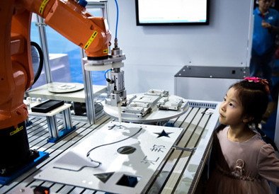 ▲在深圳舉行的第十九屆高交會上,一名小朋友在觀看機械手臂進行零部件加工(11月19日攝)。新華社記者毛思倩攝