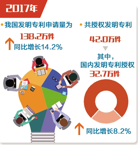近日,國家知識產(chǎn)權(quán)局發(fā)布了2017年我國發(fā)明專利有關(guān)情況和企業(yè)排名。數(shù)據(jù)顯示,2017年,我國發(fā)明專利申請量為138.2萬件,同比增長14.2%。共授權(quán)發(fā)明專利42.0萬件,其中,國內(nèi)發(fā)明專利授權(quán)32.7萬件,同比增長8.2%。專利事業(yè)迸發(fā)出量質(zhì)齊升的澎湃動力,從知識產(chǎn)權(quán)大國邁向知識產(chǎn)權(quán)強國的步伐更加堅實有力。