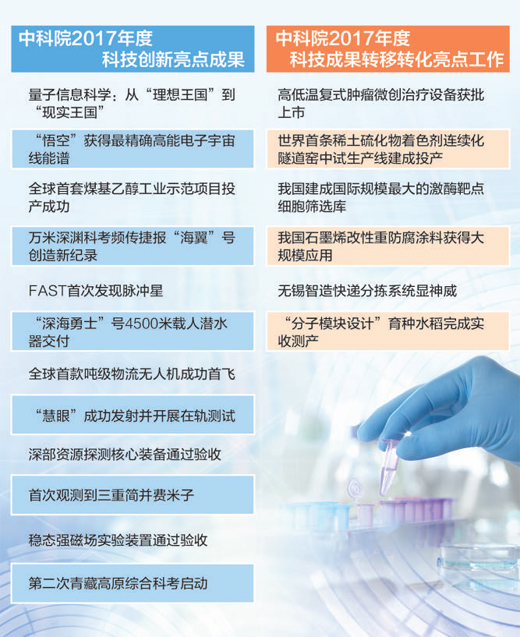 日前,量子信息科學(xué):從“理想王國”到“現(xiàn)實王國”;“悟空”獲得精確高能電子宇宙線能譜等12項獲中科院2017年度科技創(chuàng)新亮點成果。高低溫復(fù)式腫瘤微創(chuàng)治療設(shè)備獲批上市;世界首條稀土硫化物著色劑連續(xù)化隧道窯中試生產(chǎn)線建成投產(chǎn)等6項獲科技成果轉(zhuǎn)移轉(zhuǎn)化亮點工作。