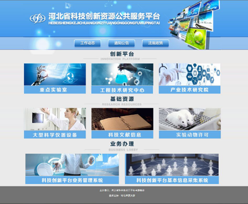 2015年12月15日,由科技廳設(shè)計(jì)開發(fā)的“河北省科技創(chuàng)新資源公共服務(wù)平臺(tái)”網(wǎng)站正式開通。該網(wǎng)站作為河北省科學(xué)技術(shù)廳廳網(wǎng)下屬二級(jí)網(wǎng)站,以科技創(chuàng)新平臺(tái)和科技創(chuàng)新資源統(tǒng)籌為重點(diǎn),系統(tǒng)整合了省級(jí)以上重點(diǎn)實(shí)驗(yàn)室、工程技術(shù)研究中心、產(chǎn)業(yè)技術(shù)研究院、大型科學(xué)儀器設(shè)備共享服務(wù)、科技文獻(xiàn)服務(wù)、實(shí)驗(yàn)動(dòng)物行政許可等分散在不同工作體系的服務(wù)功能和相關(guān)信息,集中公開展示科技創(chuàng)新平臺(tái)工作動(dòng)態(tài)、通知公告、政策法規(guī)和已建重點(diǎn)實(shí)驗(yàn)室、工程技術(shù)研究中心、產(chǎn)業(yè)技術(shù)研究院基本信息及實(shí)驗(yàn)動(dòng)物生產(chǎn)許可、使用許可信息,并鏈接河北省大型科學(xué)儀器資源共享服務(wù)聯(lián)盟、科技文獻(xiàn)服務(wù)網(wǎng)和科技創(chuàng)新平臺(tái)業(yè)務(wù)管理系統(tǒng)。